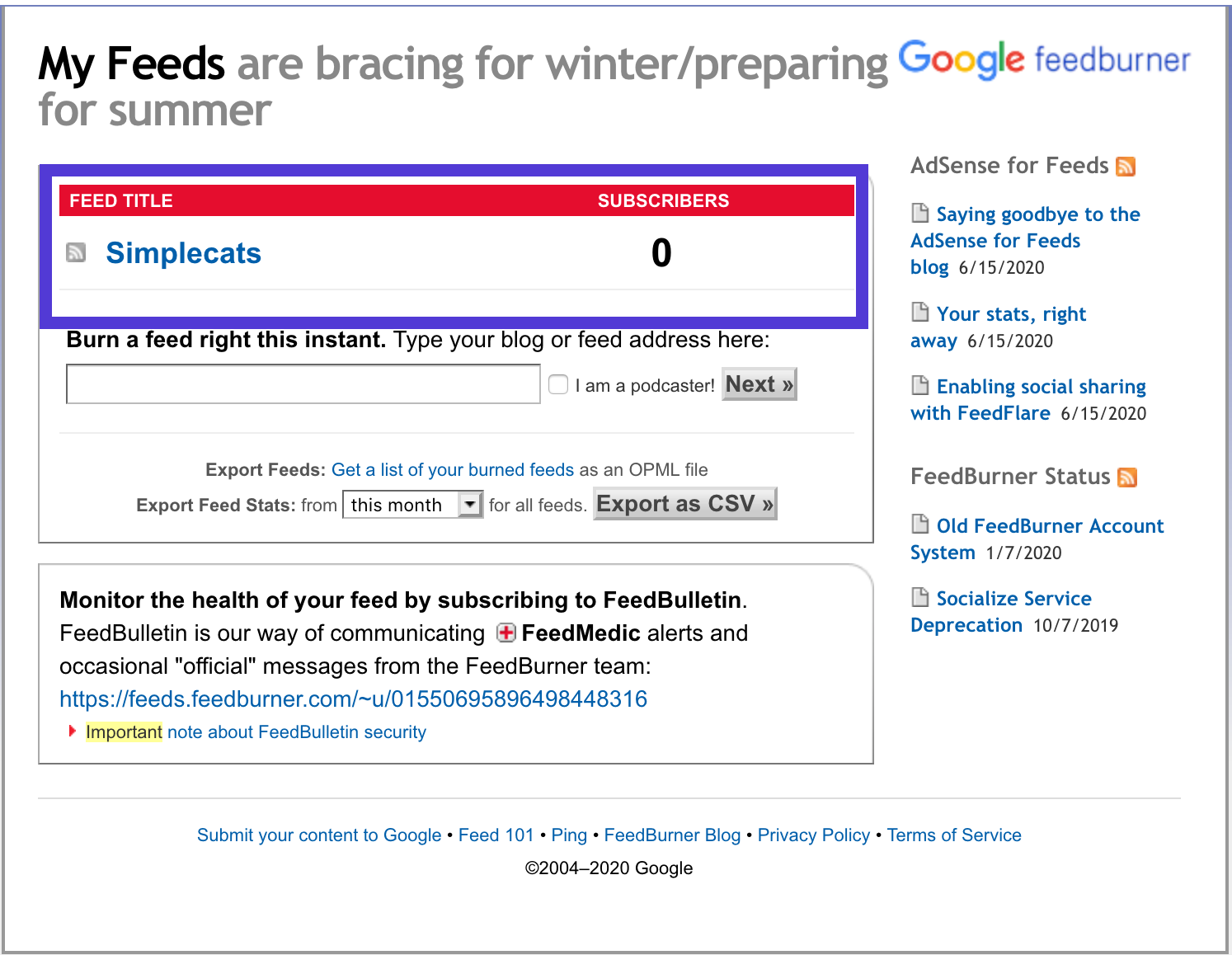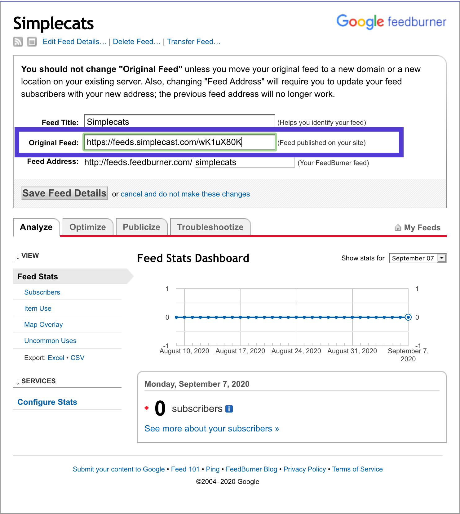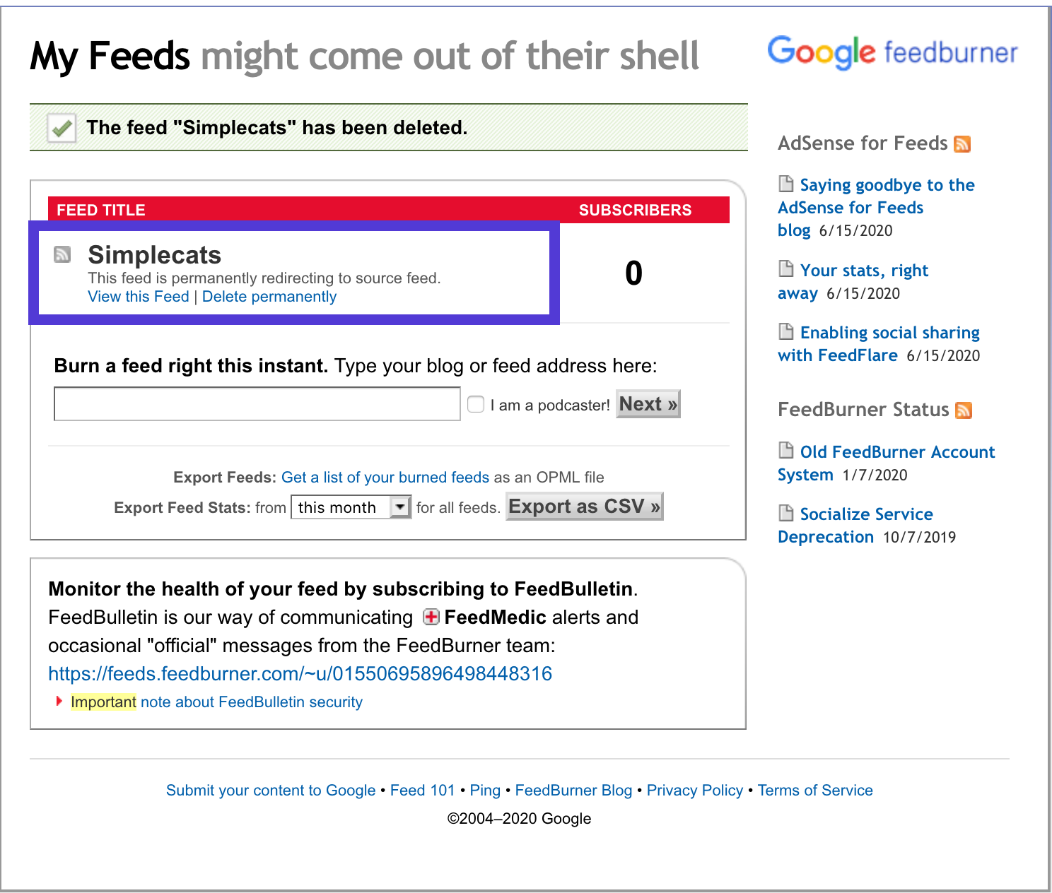 The following steps will show you how to permanently move your show off FeedBurner to Simplecast. Subscribers to your FeedBurner RSS feed will be automatically redirected to your Simplecast RSS Feed.