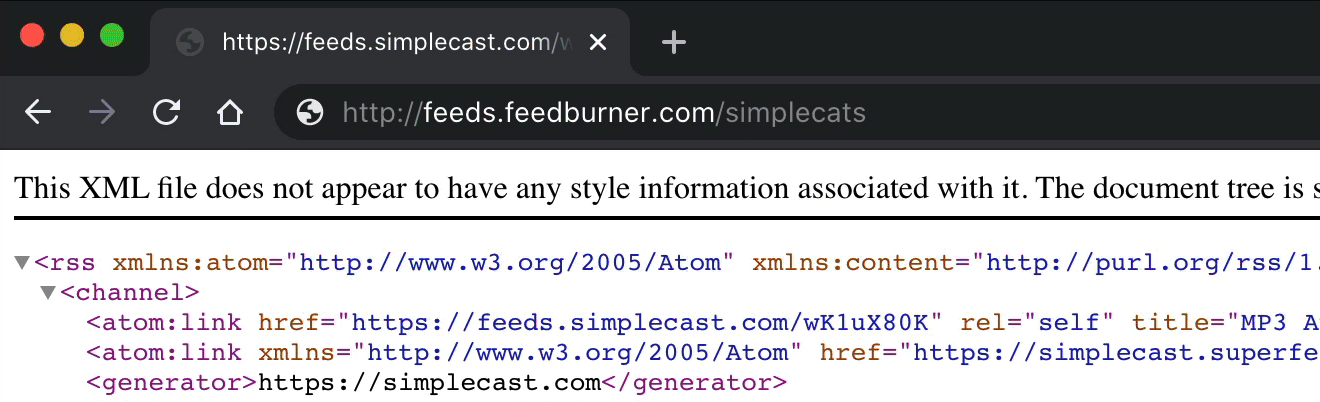 If the URL in the address bar changes to your Simplecast RSS Feed URL, then the 301 Redirect is working!