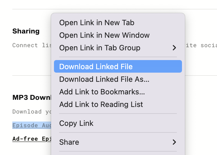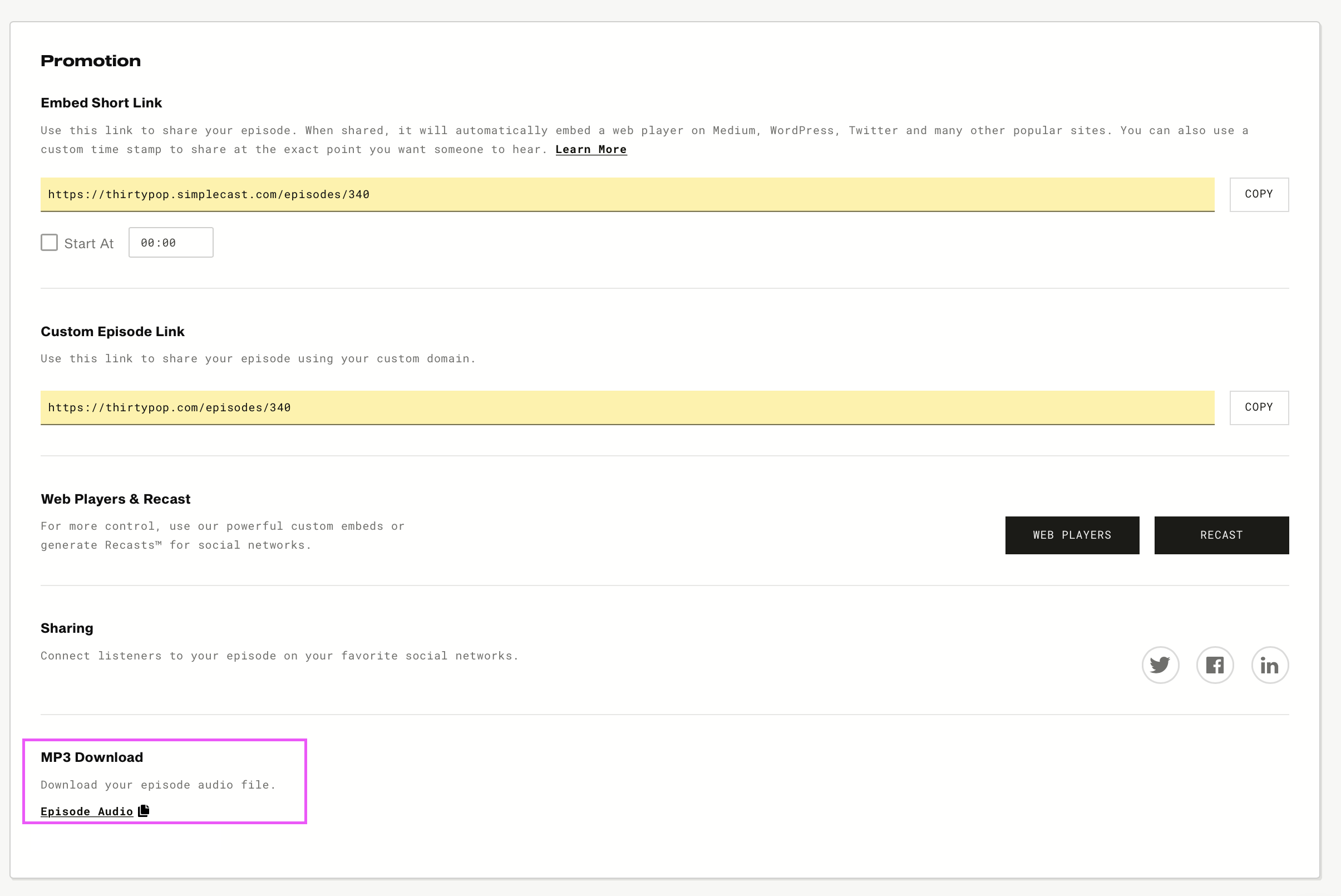 Scroll down to the PROMOTION section, and right-click on the EPISODE AUDIO link